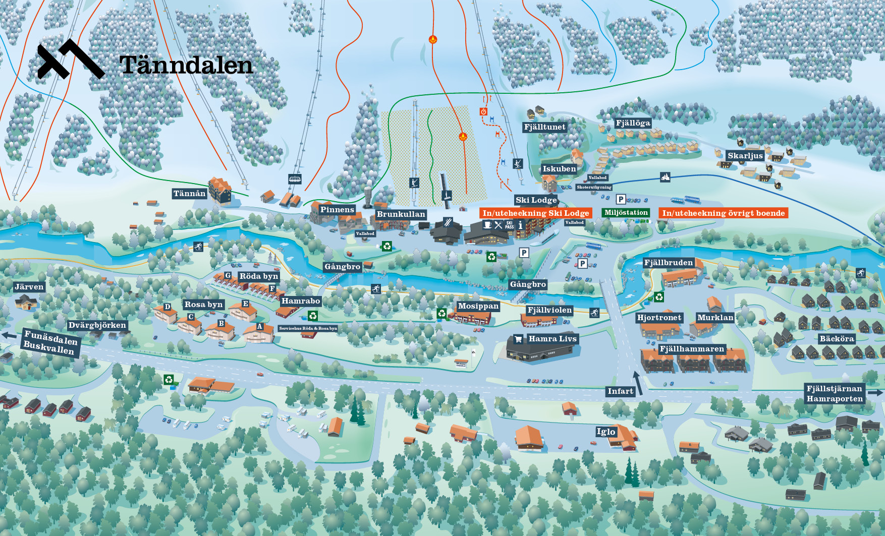 Med liftar, pister, skidskola och Hamra Sportshop med uthyrning och butik precis utanför dörren får du en smidig start på dagen. Bara några steg bort väntar dessutom 300 km preparerade längdspår och 610 km skoterleder, redo att utforskas.